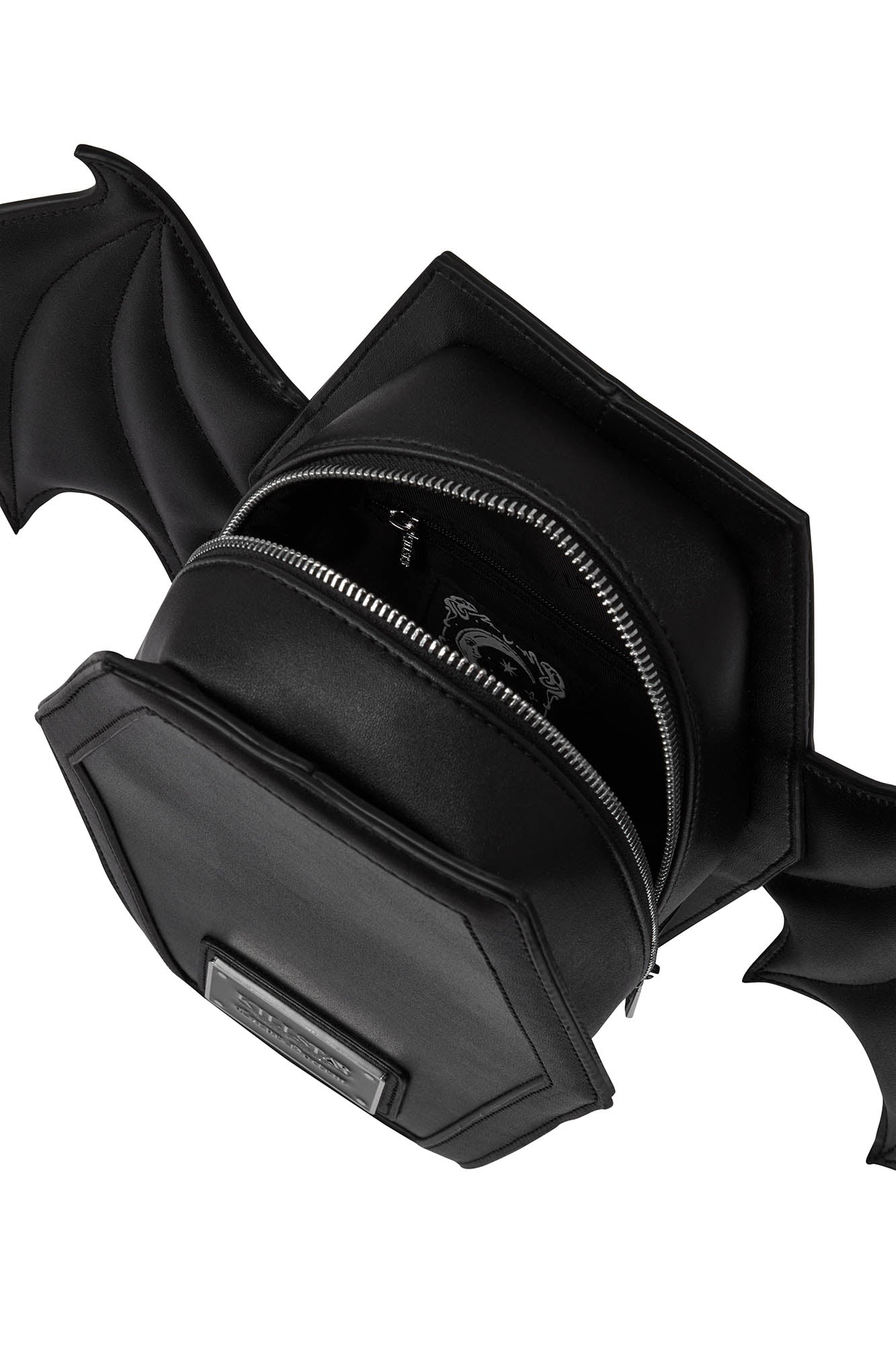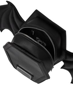 All hail the dead – this coffin-shaped ‘Sickly Sweet’ backpack ticks all yer goth boxes; side wings, slick design of faux leather and cute backpack strap back. Doubles up like a handy shoulder bag – so u can suit yer moodz. Zip closure and fully lined.