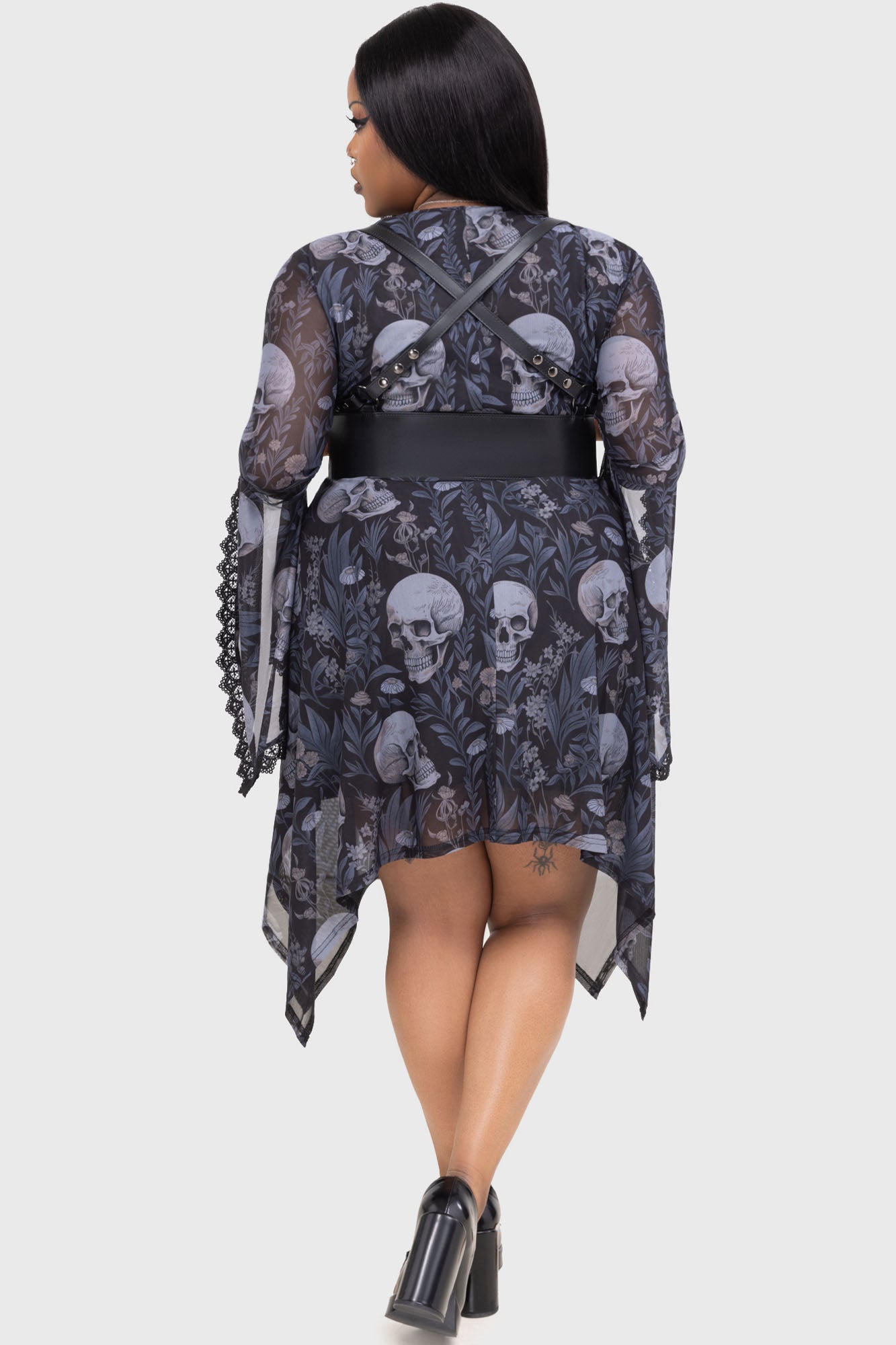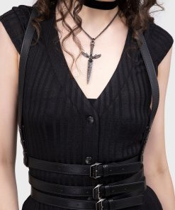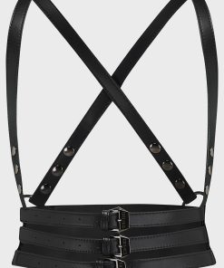 – Three adjustable custom coffin belt buckle straps around the front waist.