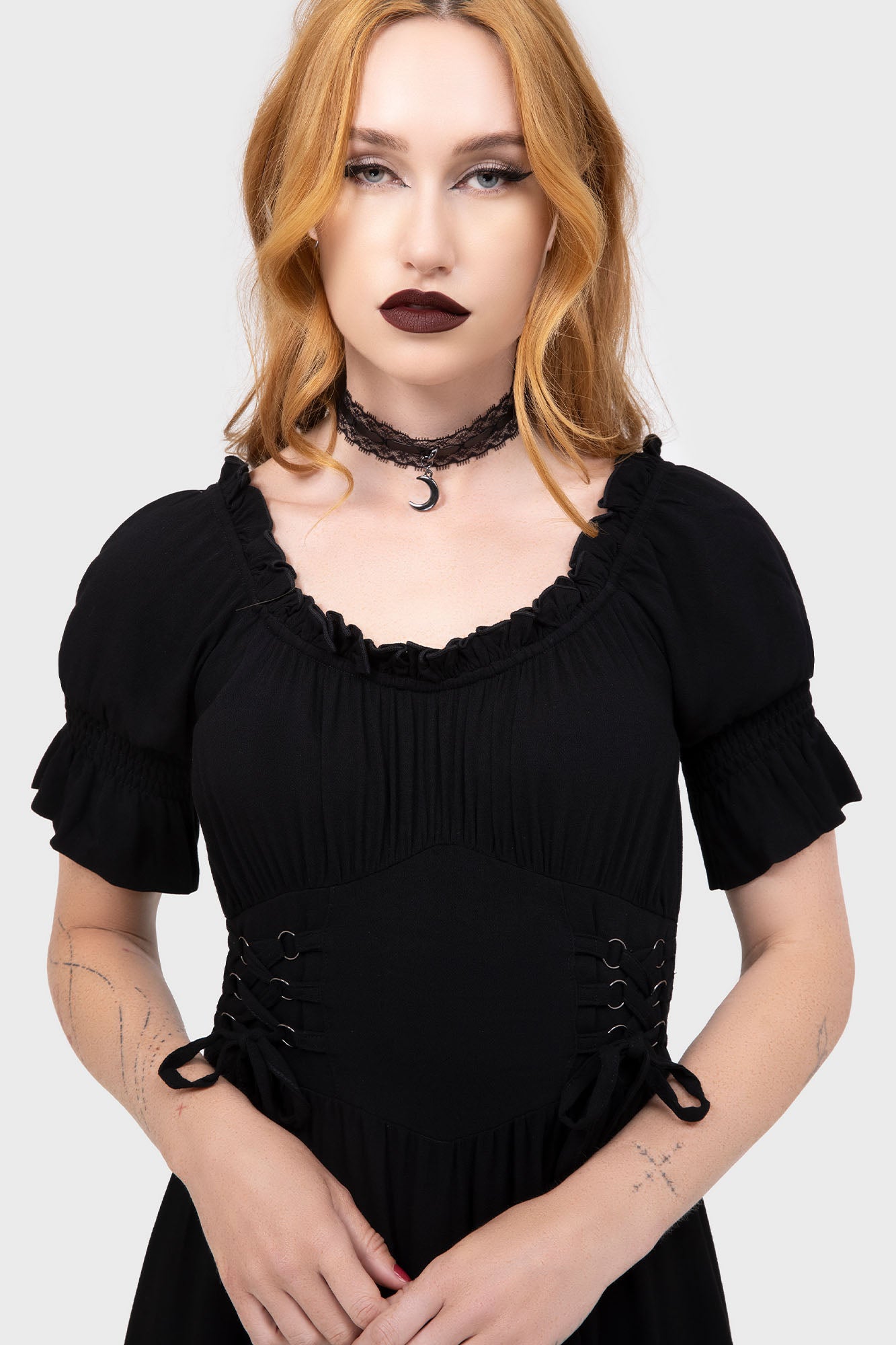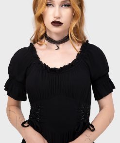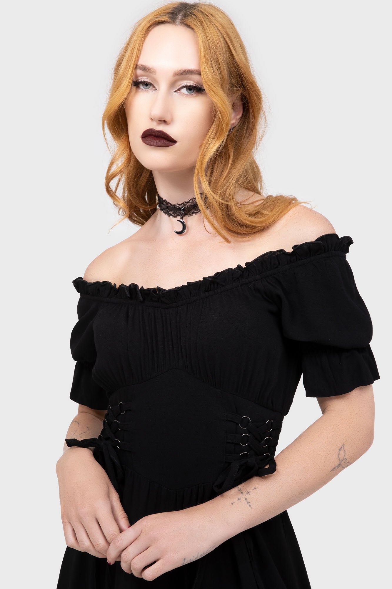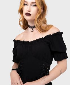 – Elasticated neckline which can be worn on or off shoulder, creating square and Bardot necklines.
